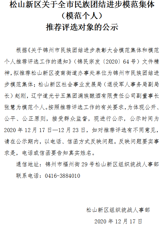 松山新區關于全市民族團結進步模范集體(模范個人)推薦評選對象的公示