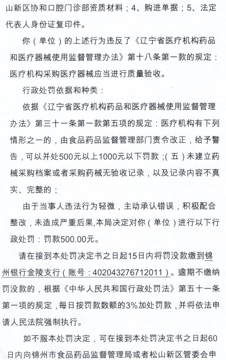 關于協和口腔門診部和凌南街道橋南社區衛生服務站未建立醫療器械購進驗收記錄案件的處罰決定書公示