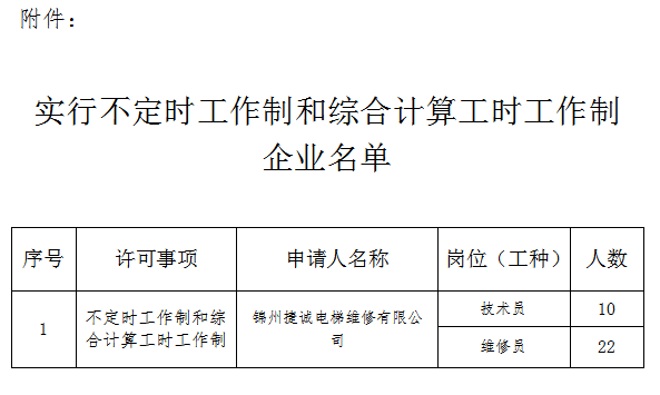 根據《中華人民共和國勞動法》第三十九條、《中華人民共和國行政許可法》第三十八條的有關規定,對錦州捷誠電梯維修有限公司部分工作崗位實行綜合計算工時工作制審批情況予以公示,接受社會監督。