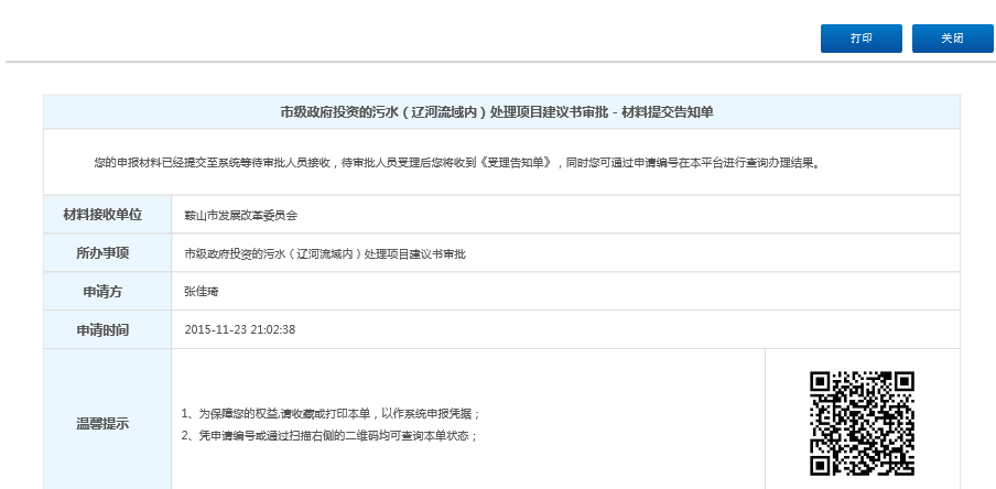 點擊關閉按鈕會看到該事項的辦理狀態及時間從未提交變成待接件(已成功申報但審批人員還未接件),操作變成已報件(網上)