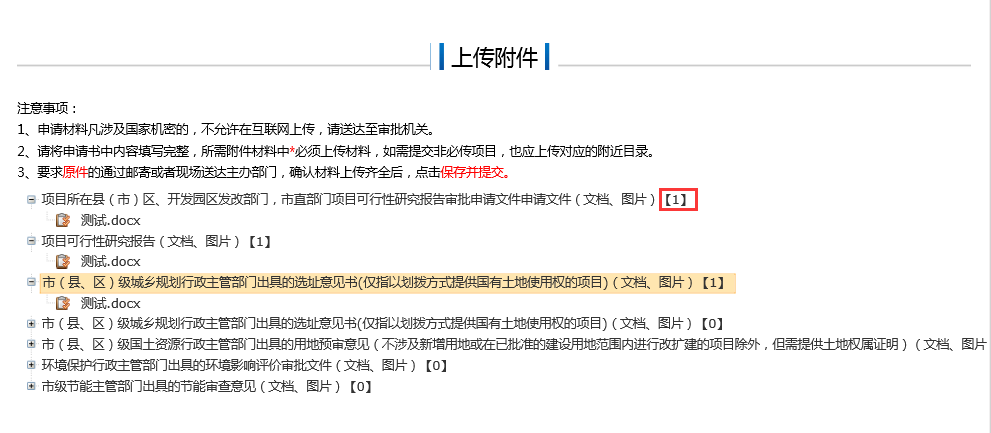文檔、圖片后面的數字為該項附件材料已上傳的個數,申請表單附件材料填寫完成后點擊保存并提交會出現一個材料提交告知單,代表該項審批已提交成功。
