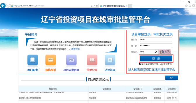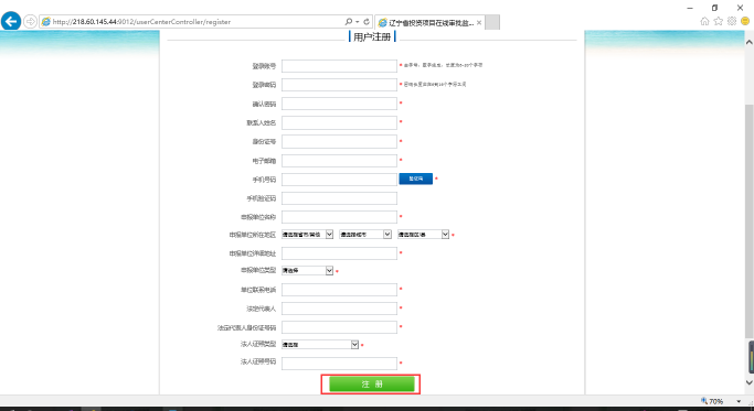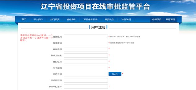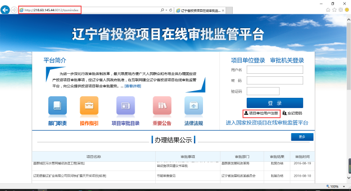 在地址欄中輸入http://218.60.145.44:9012 進入遼寧省投資項目在線監管平臺,點擊項目單位用戶注冊: