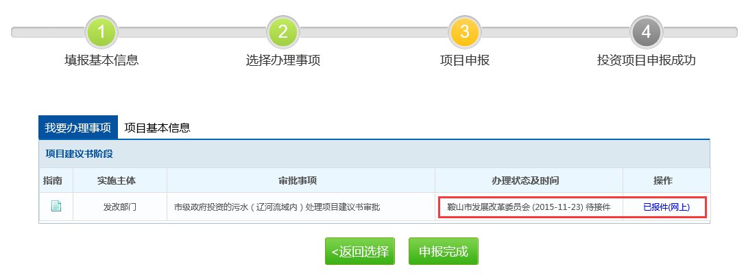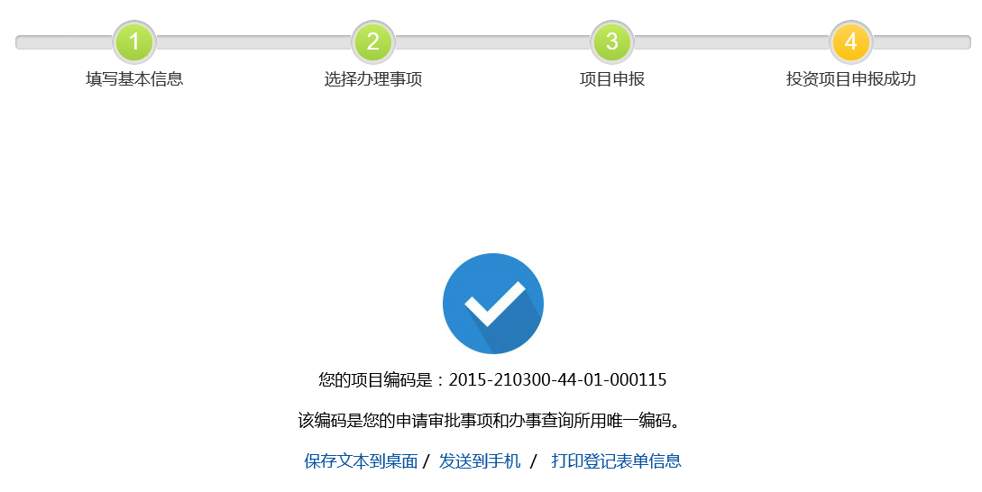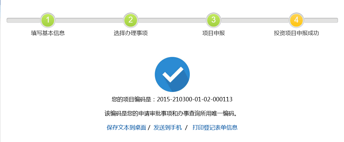 系統自動生成一個項目編碼,該編碼是申請審批事項和辦事查詢所用的唯一編碼,該項目的項目建議書階段完成。