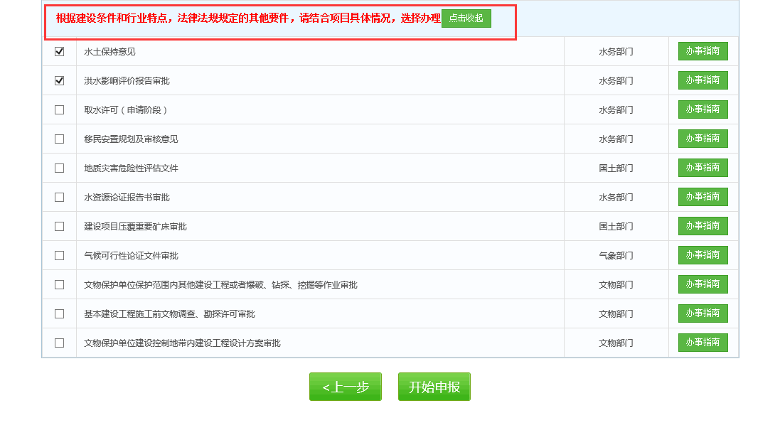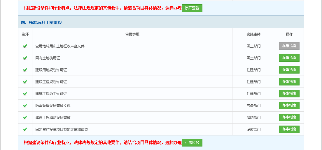 9.進入項目申報頁面,會看到當前核準目錄涉及的所有審批事項,打鉤的為必選項,點擊核準后開工前要件的展開查看按鈕可以打開當前核準目錄的可選事項。根據實際情況選擇。選擇完畢后點擊開始申報。
