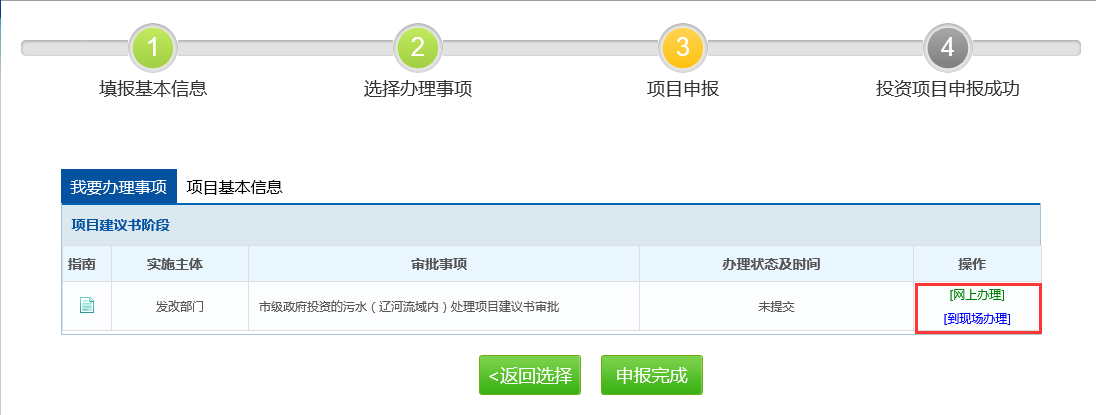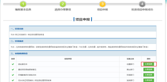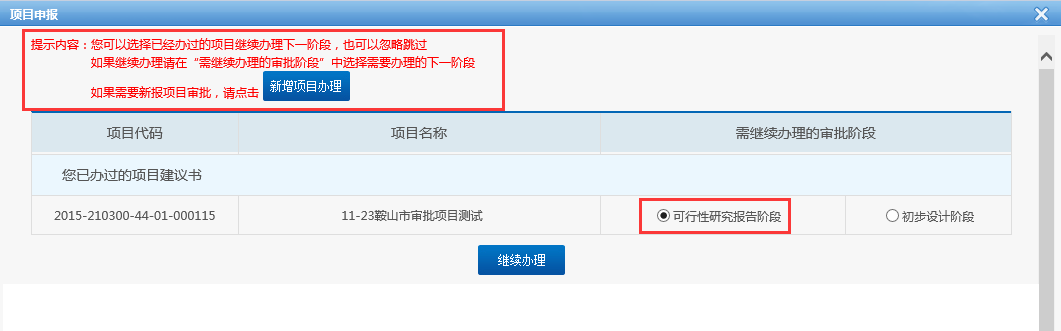 項目建議書階段辦結之后,用戶可以繼續辦理該項目的其他階段,在點擊申報項目時,系統會通過查詢這個證照號碼下的所有的審批項目,將其羅列出來。用戶根據實際情況選擇繼續辦理該項目的下一階段,還是重新進行項目辦理。
