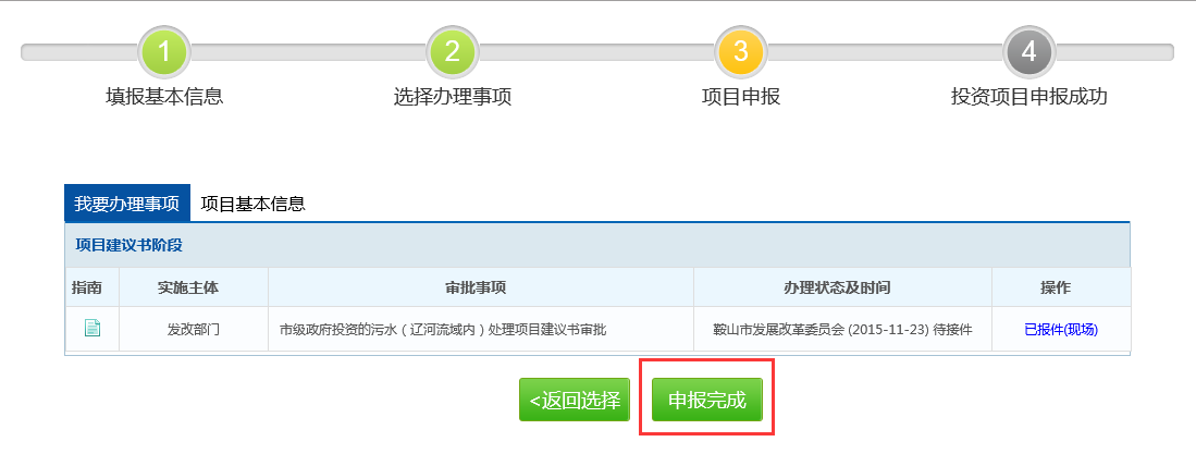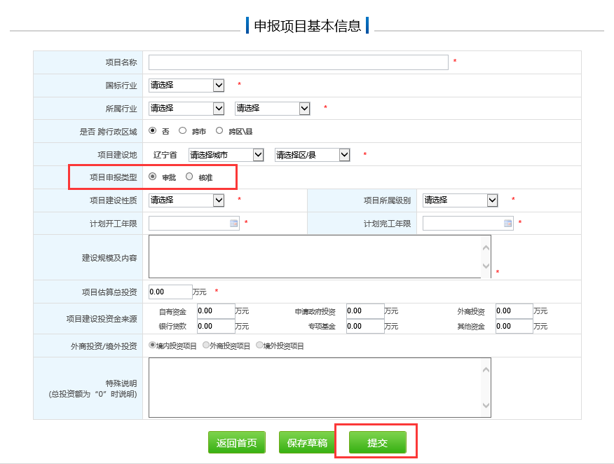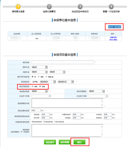 填寫申報項目基本信息,其中項目申報類型分為審批和核準,申請哪一個項目就選擇哪一個申報類型:基本信息填寫完后點擊提交