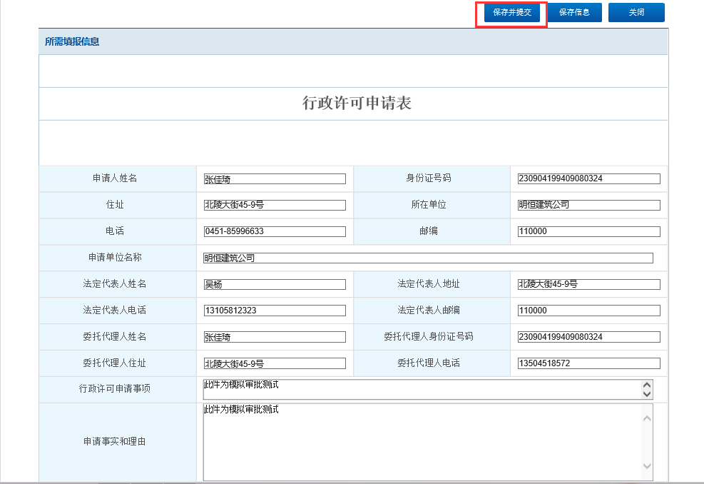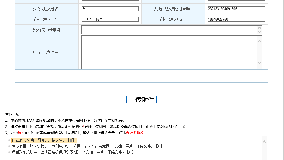 11.點擊網上辦理后需要填寫行政許可申請表,表單必須信息完整真實,并上傳當前辦事事項所需的材料。填完后點擊保存并提交,完成辦理。
