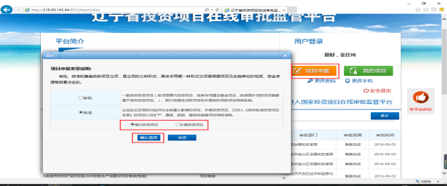 6.點擊項目申報后在彈出的對話框內選擇申報類型:審批、核準。其中,核準分兩種情況一種是境內投資項目;一種是外商投資項目。