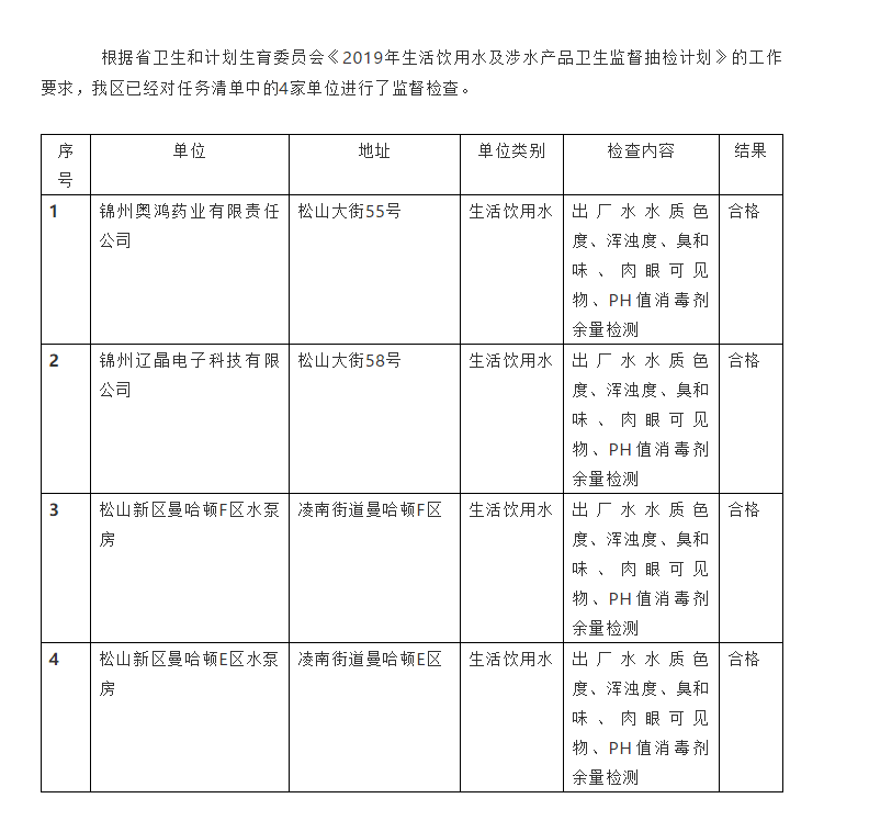 2019年松山新區“雙隨機”生活飲用水及涉水產品衛生監督檢查結果公開情況