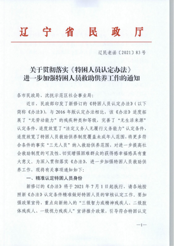 關于貫徹《特困人員認定辦法》進一步加強特困人員救助供養工作的通知